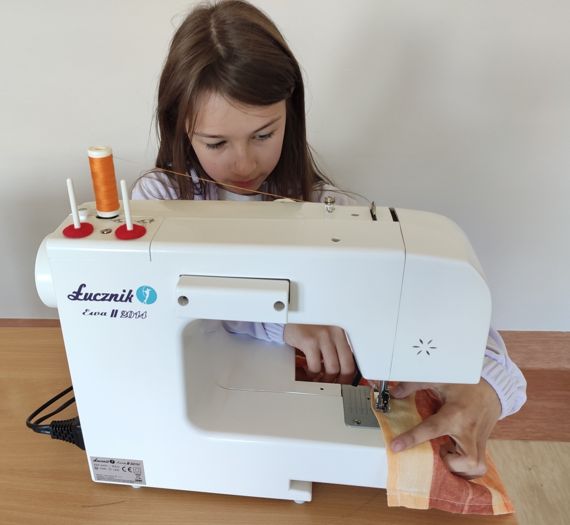Uczniowie klasy piątej mieli okazję ćwiczyć umiejętność szycia na maszynie z wykorzystywaniem przyborów krawieckich oraz tekstyliów zakupionych w ramach programu #LaboratoriaPrzyszłości. Początkowe zajęcia przeznaczono na zapoznanie z budową, możliwościami i zasadami bezpiecznego użytkowania i konserwacji maszyny do szycia. Obecnie uczniowie wykonują pierwsze ściegi na materiale, poznają tajniki szycia, potrafią szyć wybranymi przez siebie ściegami, łączą różne materiały i poznają ich właściwości.